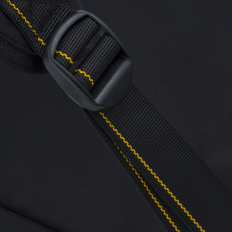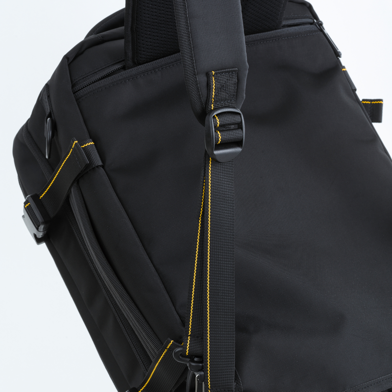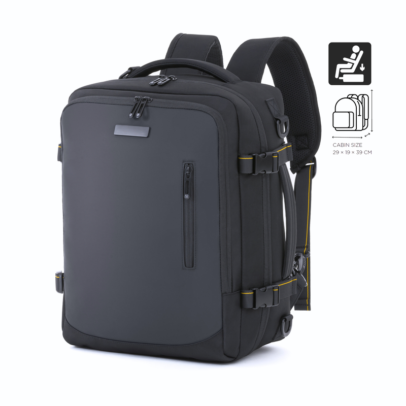 A compact and versatile cabin backpack made from bamboo-grain polyester with matte TPU accents. Features two compartments, adjustable side straps, a top and side handle, and hidden shoulder straps for flexible carrying. The interior is designed like luggage for organized packing. REACH certified.