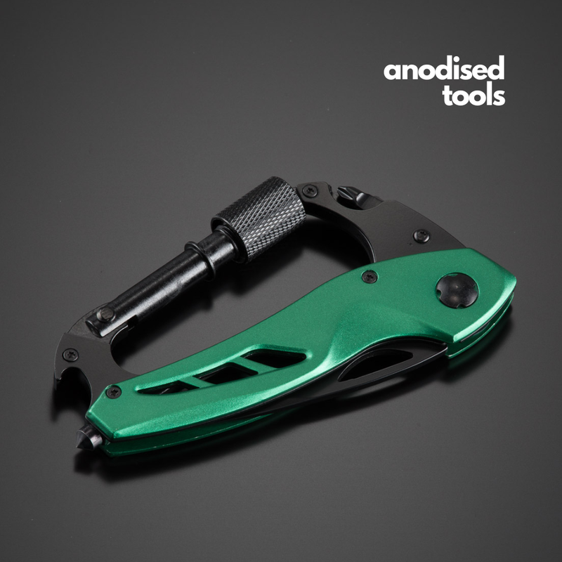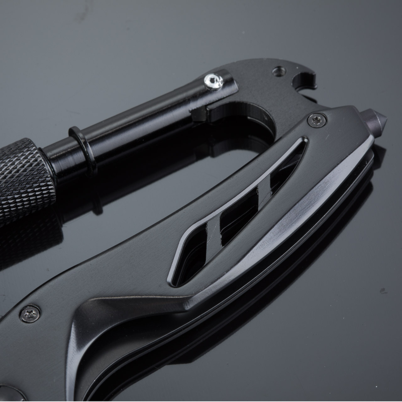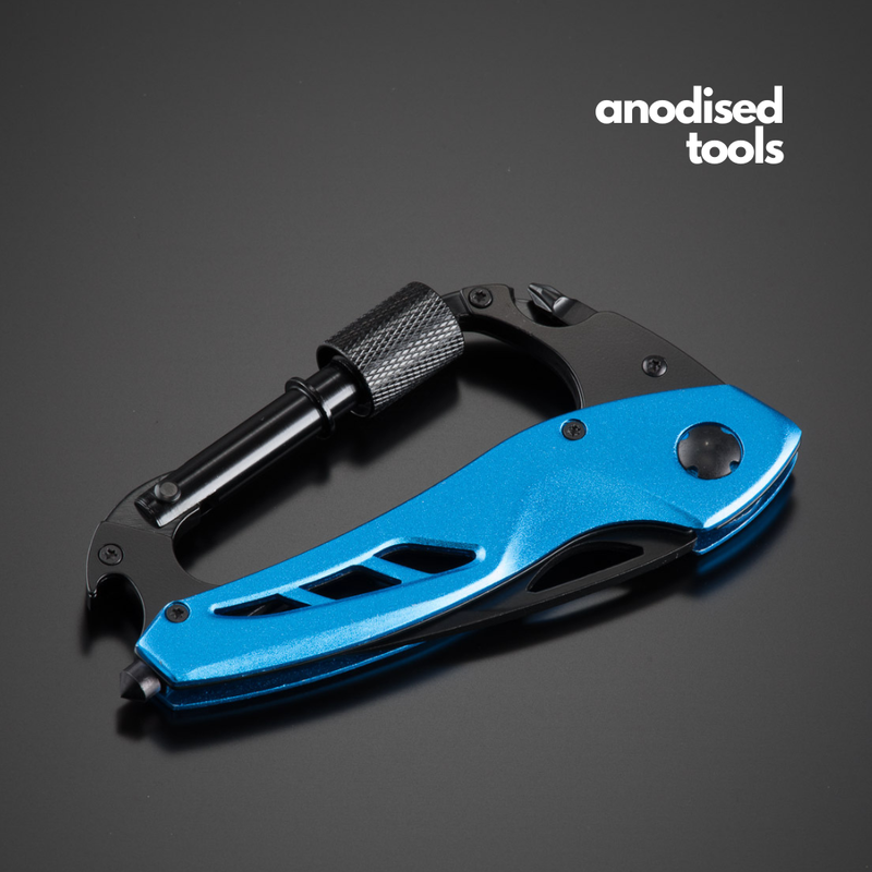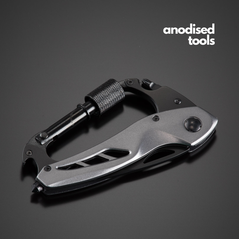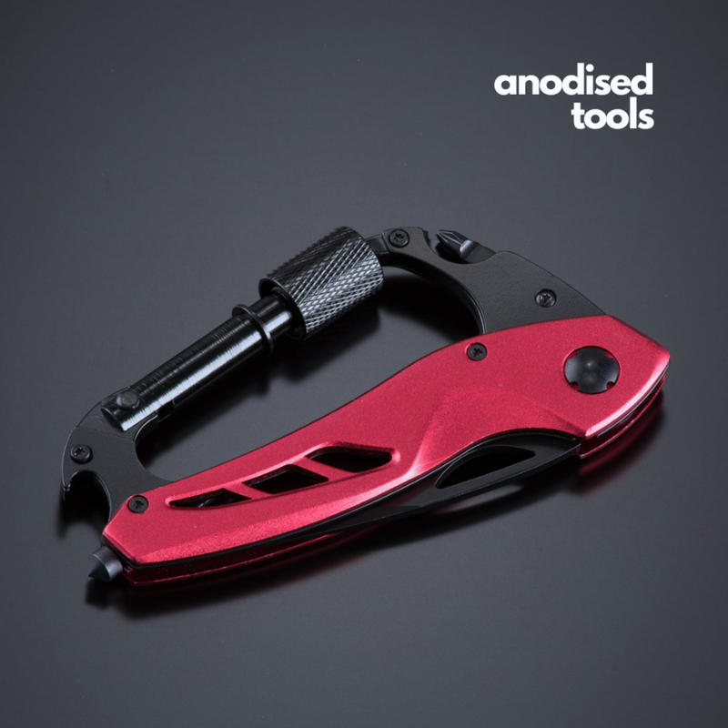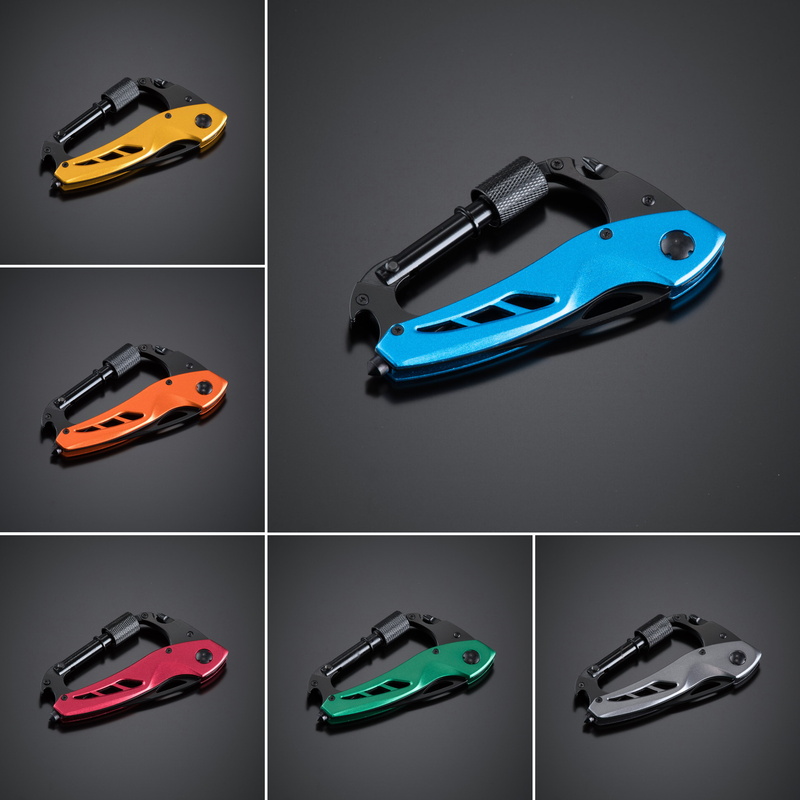 Main features: sharp stainless steel knife, flat and scalloped wrench tip, shackle-type handle, glass punch, bottle opener. Folding, can be clipped to trousers or backpack. Colour anodised metal body, finished with a large carabiner.