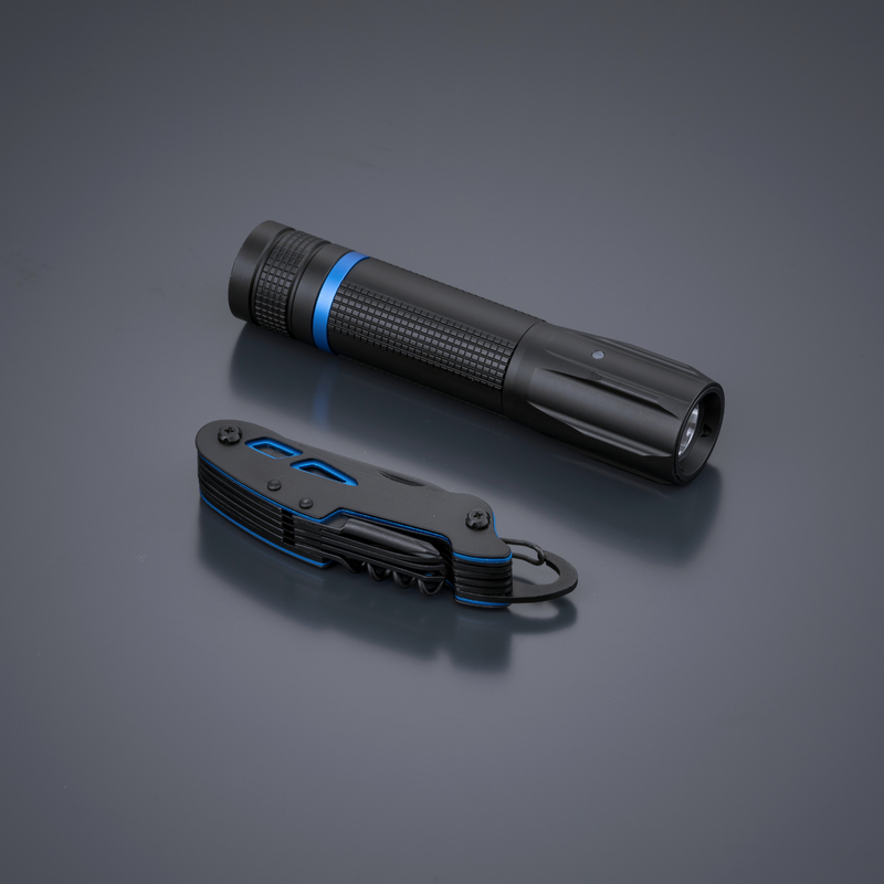 The practical set includes a titanium pocket knife and a handy small flashlight. Optima pocket knife in new guise, made of high-quality stainless steel with titanium coating for improved hardness and extra corrosion resistance. Colorful inserts on the handle for subtle decoration. Led torch is made of high-quality aluminum, it features a strobe mode as well as SOS light.