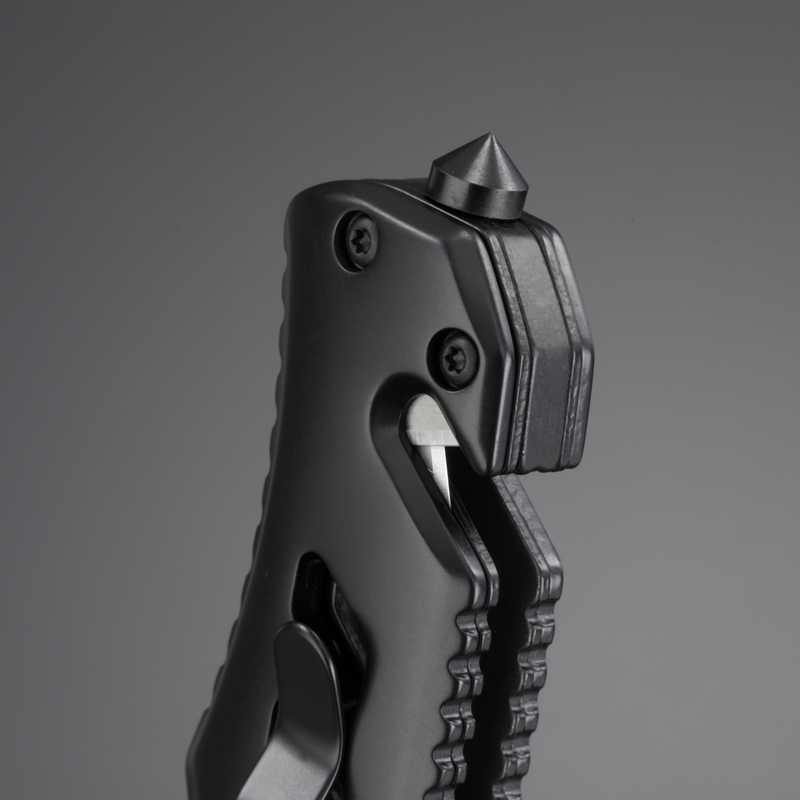– Ergonomically shaped handle equipped with a solid glass breaker and seatbelt cutter.