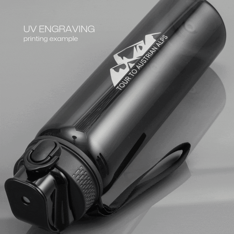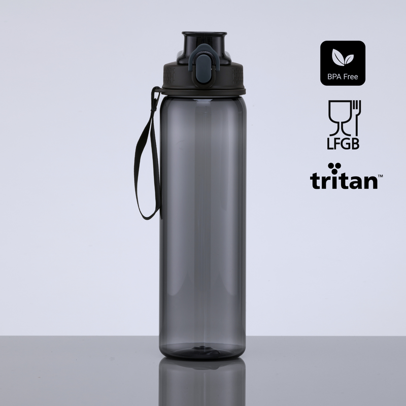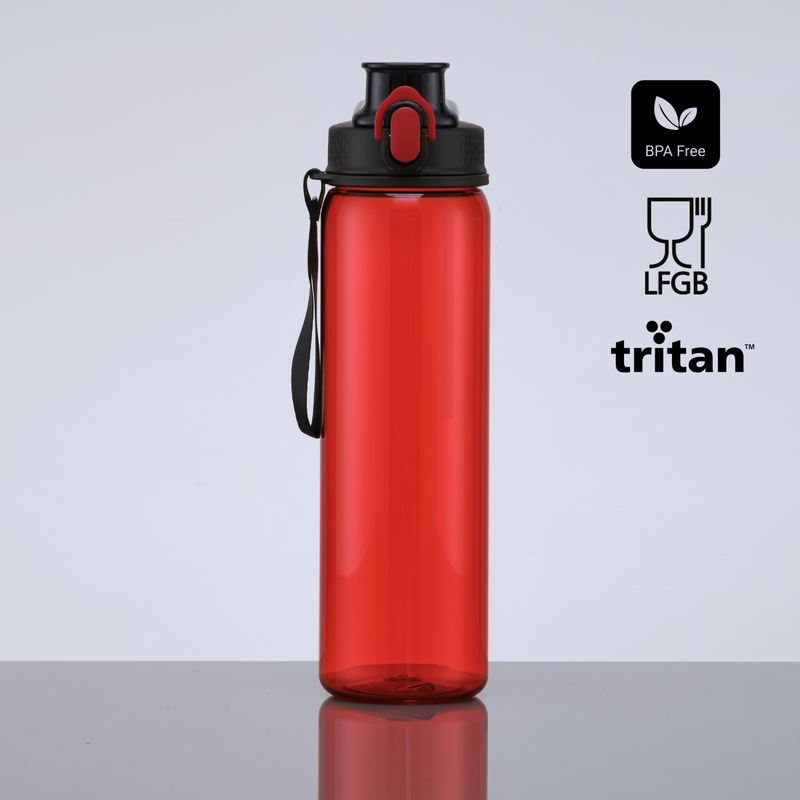 The innovative design includes a convenient one-click opening mechanism for quick and easy access to your beverage. When not using the bottle, you can lock the cap to prevent the contents from spilling. The wide opening allows you to put ice cubes inside. The bottle is also equipped with a material handle for convenience. Dishwasher safe. Capacity: 750ml