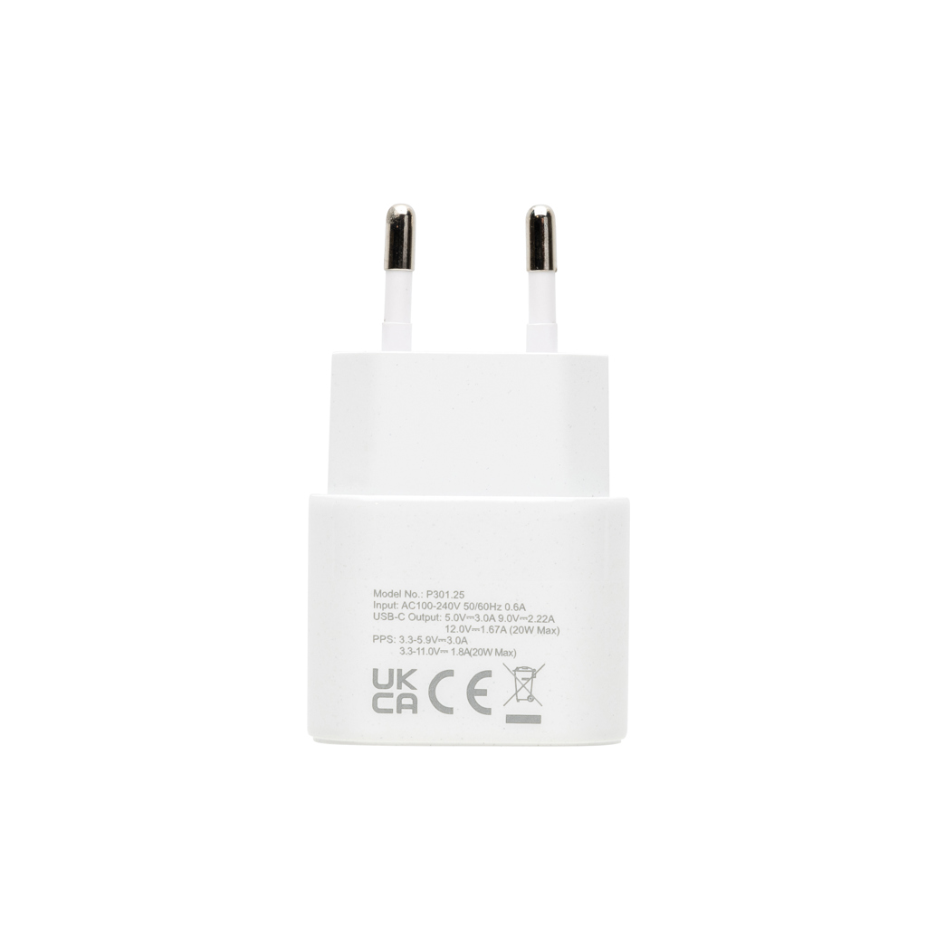 2 pcs 20W fast charging set for mobile devices and other small devices. With EU adapter with 20W USB C port and 120 cm recycled TPE 60W fast charging cable (USB C to USB /Lightning). The cable supports data transfer and also charging of larger devices like laptops. Adapter and cable made from RCS certified recycled PC, ABS and recycled TPE. Packed in pouch made from RCS certified recycled PET. Total recycled content of whole set: 59% based on total item weight. RCS certification ensures a completely certified supply chain of the recycled materials. Packed in FSC® packaging. PVC Free. Input wall charger AC 100-240V 50/60Hz 0.6A, Output wall charger USB-C :5.0V⎓3.0A,9.0V⎓2.22,12.0V⎓1.67A (20W Max),