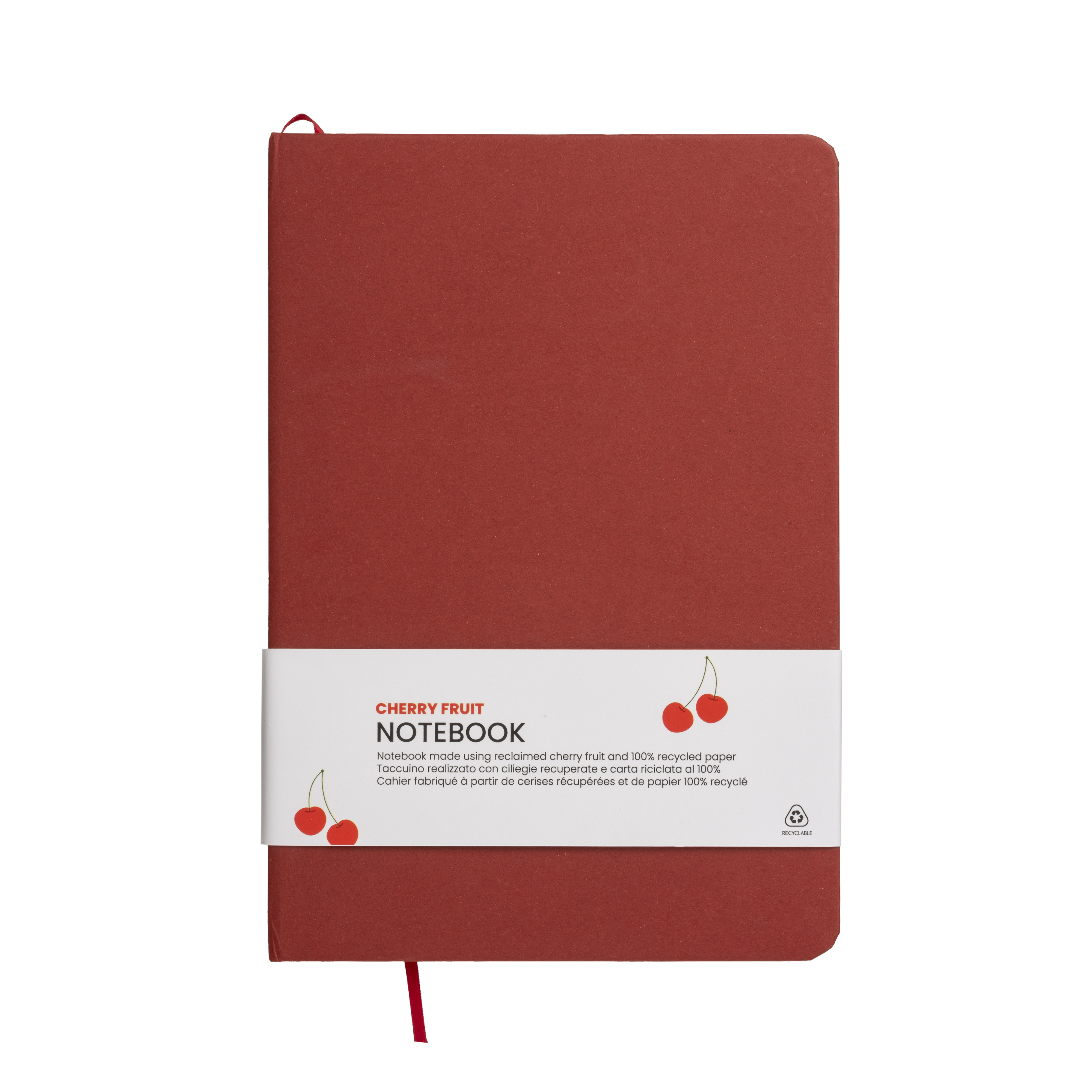 Notebook with cover made from the residue of coffee beans, cherry, lavender, lemon, corn and kiwi. Striped sheets on ivory recycled paper (80 pages), elastic closure and matching satin bookmark
